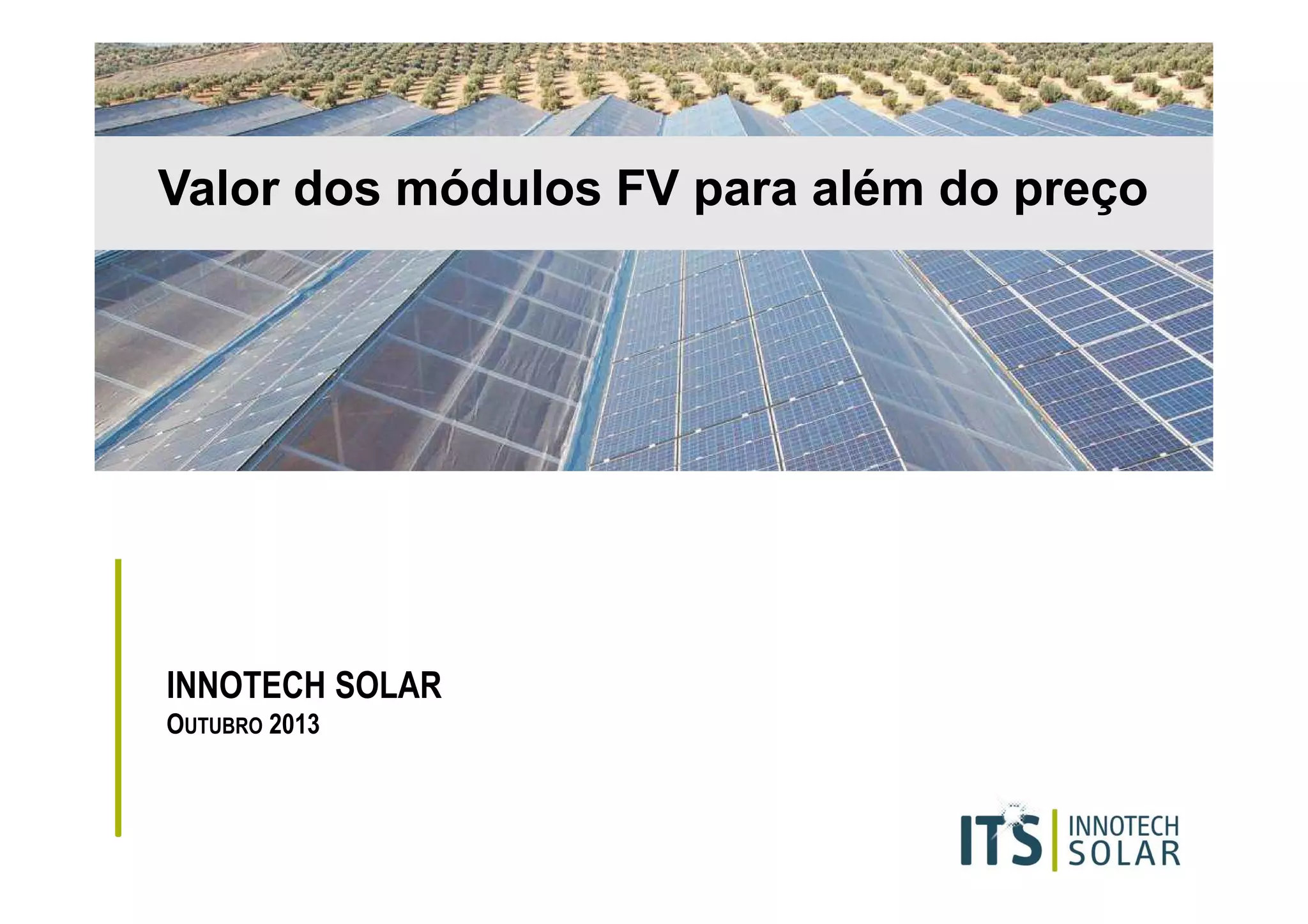 O documento discute os módulos fotovoltaicos produzidos pela empresa Innotech Solar. A empresa fabrica módulos de alta qualidade na Alemanha e Suécia e otimiza as células solar para melhorar o desempenho e prevenir hot spots. Os módulos da Innotech Solar oferecem alto rendimento a um bom custo-benefício.