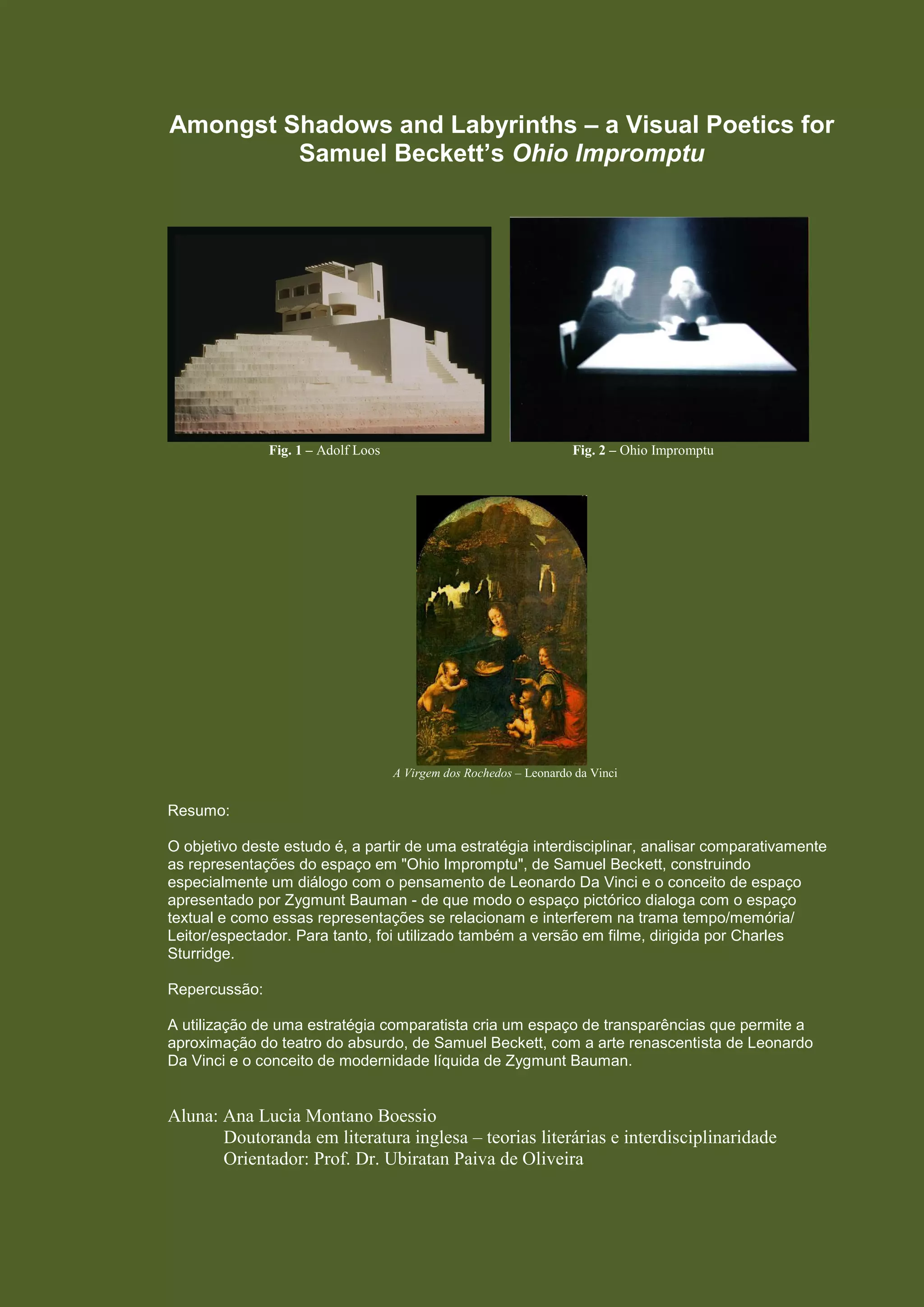 This study analyzes representations of space in Samuel Beckett's "Ohio Impromptu" through an interdisciplinary approach, drawing comparisons to Leonardo Da Vinci's paintings and Zygmunt Bauman's concept of space. It uses Beckett's film version directed by Charles Sturridge.