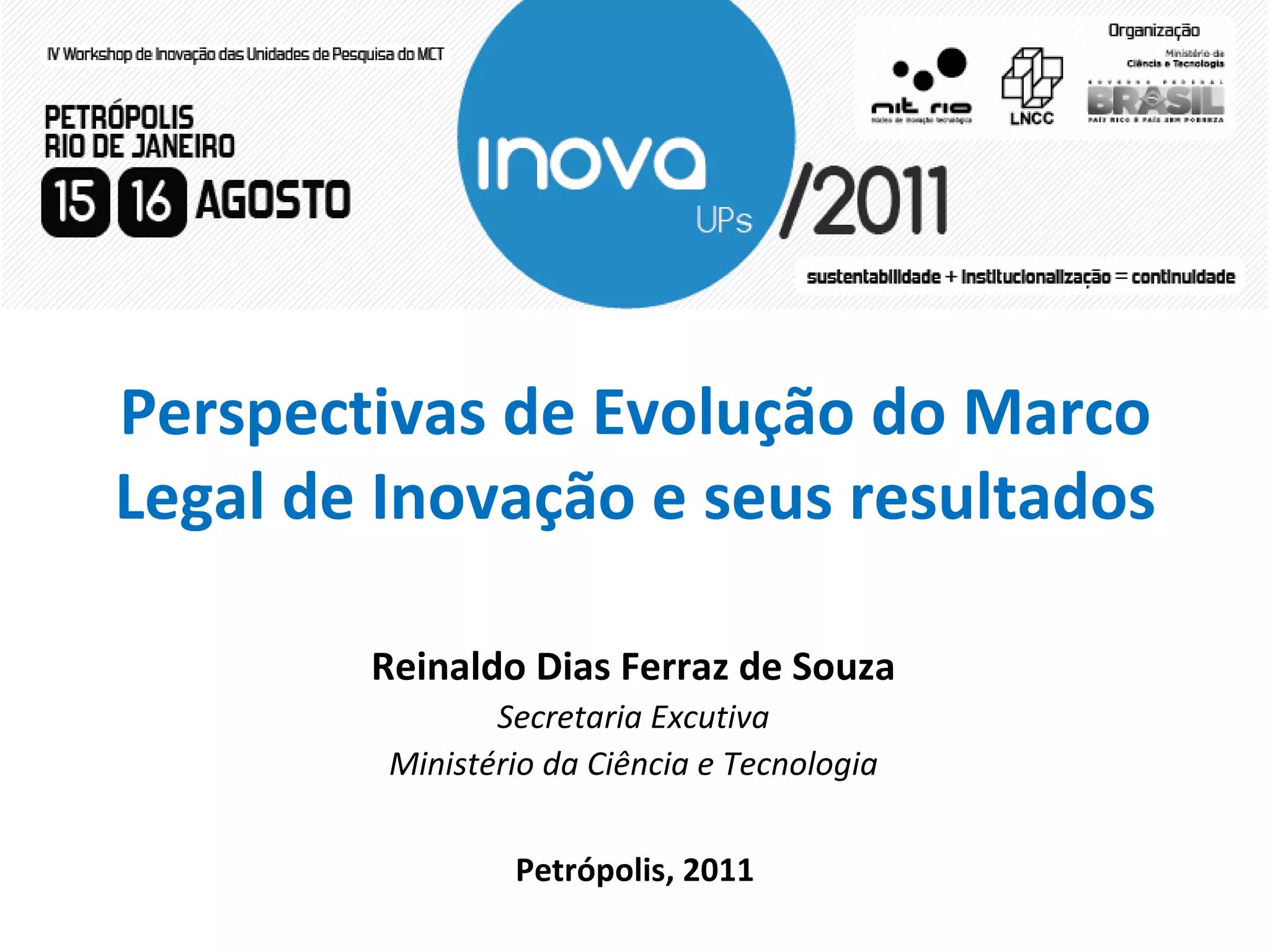 Este documento discute as perspectivas de evolução do marco legal de inovação no Brasil e suas medidas. Resume 47 medidas identificadas, das quais 20 já foram resolvidas, incluindo a Lei da Inovação e a Lei do Bem, com foco em incentivar a inovação tecnológica e a competitividade das empresas brasileiras.