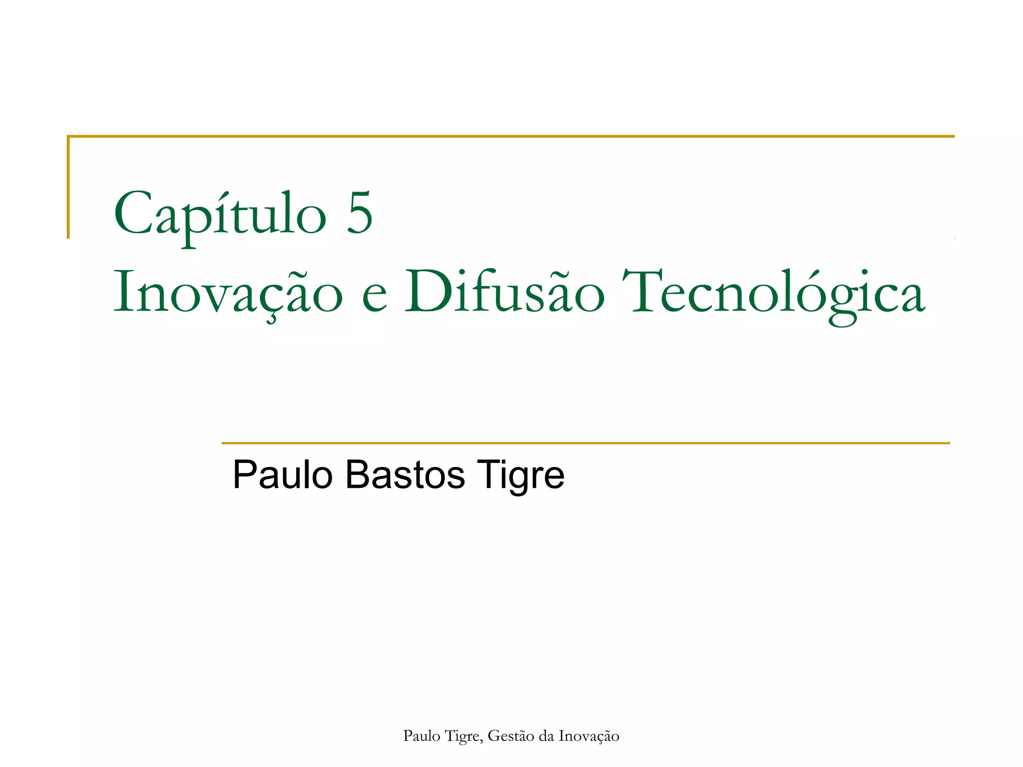 O documento discute conceitos de inovação e difusão tecnológica, incluindo tipos de mudanças tecnológicas, fatores indutores da inovação e modelos de difusão. É apresentada uma taxonomia das mudanças tecnológicas de acordo com seu impacto econômico e discutidos conceitos como invenção, inovação e difusão.