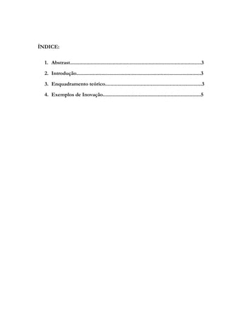 Este documento descreve um trabalho acadêmico sobre inovação realizado por alunos de gestão de marketing. O trabalho pretende descrever inovação com exemplos e apresentar um mapa mental sobre o tema, abordando conceitos como inovação de produto, processo, organizacional e de marketing.