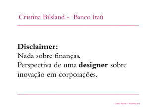 O documento discute como as abordagens de co-criação, design thinking e processo aberto-fechado podem ser usadas para promover a inovação em corporações. A palestrante Cristina Bilsland explica que a inovação requer novas formas colaborativas de trabalho focadas no usuário e experimentação, além de direcionamento estratégico e curiosidade.