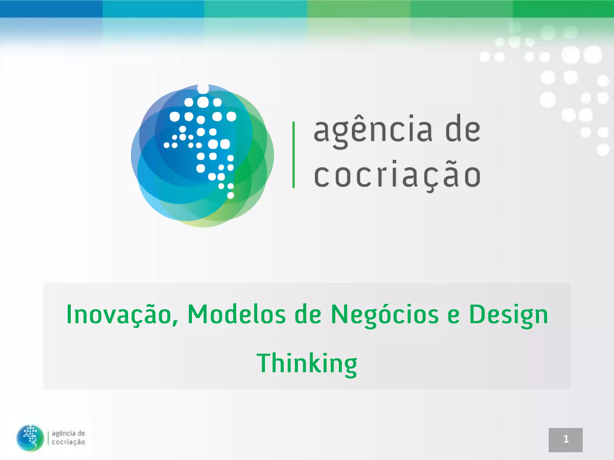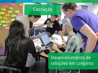 O documento apresenta os princípios e ferramentas do Design Thinking para inovação em modelos de negócios, gestão, serviços e produtos. Explica como a Agência de Cocriação utiliza workshops colaborativos com base no Design Thinking para ajudar empresas a inovarem seus modelos de negócios e desenvolverem soluções criativas.