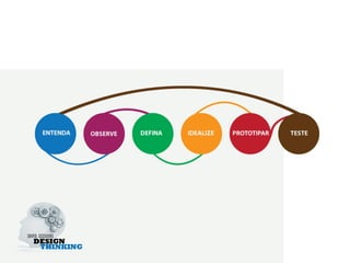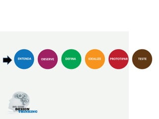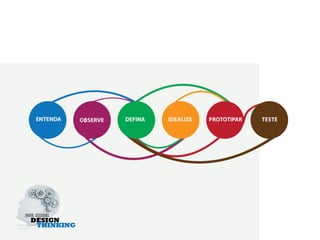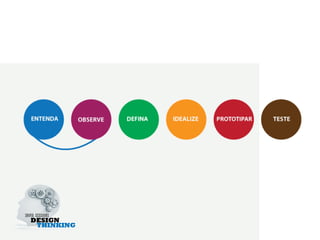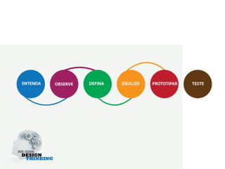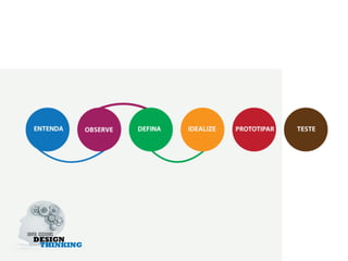 O documento discute os conceitos e métodos do design thinking, apresentando-o como um processo de inovação centrado no usuário que envolve observação empática, geração de ideias criativas e prototipagem para testar soluções. O design thinking é descrito como essencialmente um facilitador para inovação que começa com perguntas abertas e valoriza a imaginação para atender necessidades não articuladas dos usuários.