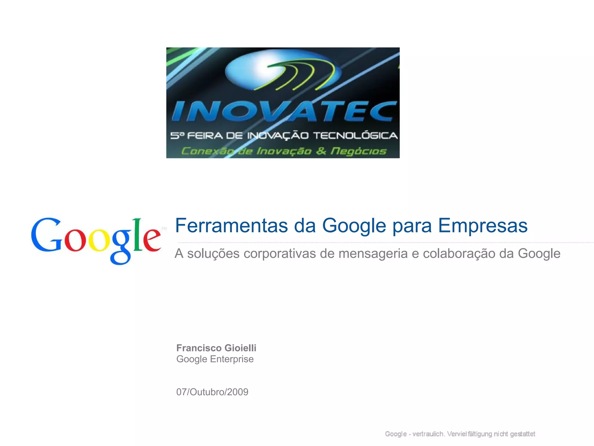 Este documento discute as soluções de mensageria e colaboração da Google para empresas. Apresenta os produtos Google Apps que incluem Gmail, Calendar, Docs e Sites para colaboração online sem os custos e problemas típicos de TI. Também discute as ferramentas de geotecnologia da Google como Maps e Earth e como elas são usadas por milhares de sites e organizações.