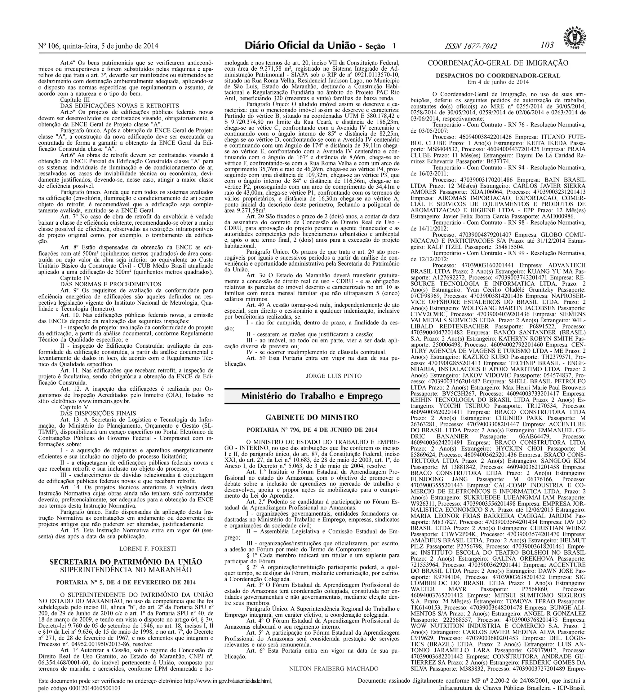 Este documento resume uma portaria que autoriza a cessão de uso gratuito de terras da União ao estado do Maranhão para construção habitacional de baixa renda. A portaria define prazos de 2 anos para aprovação do projeto e execução da obra e prevê a transferência das terras às famílias beneficiadas.