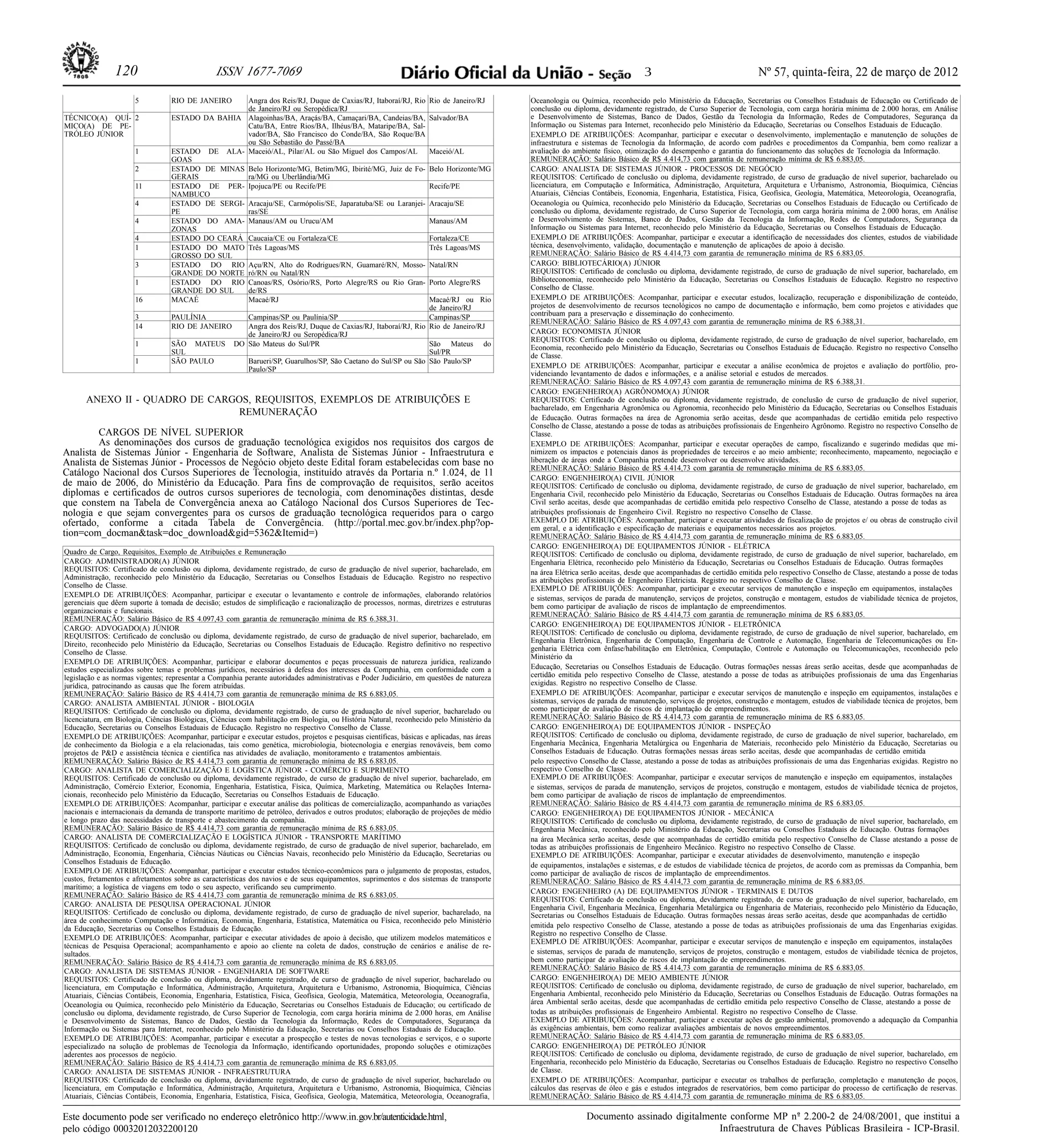 3) Também são descritas brevemente as atribuições dos cargos, como acompanhar projetos, realizar análises, prestar serviços de manutenção e executar operações de campo.