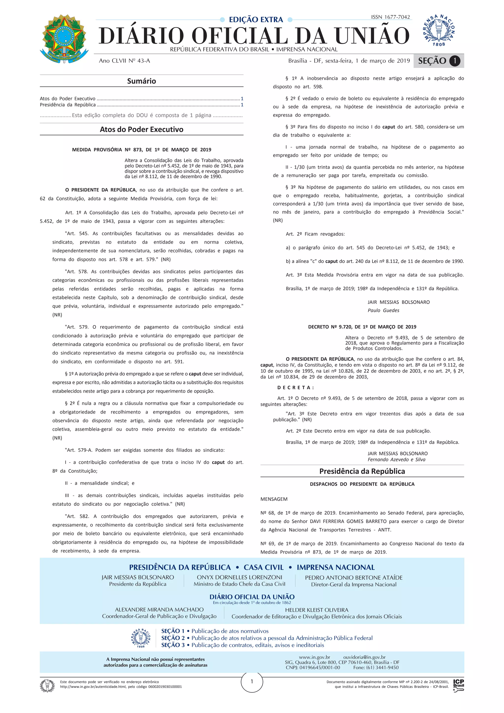 O documento descreve duas medidas do Poder Executivo: 1) A Medida Provisória no 873 altera a legislação trabalhista para tornar a contribuição sindical voluntária; 2) O Decreto no 9.720 altera o prazo de vigência de outro decreto sobre controle de produtos.