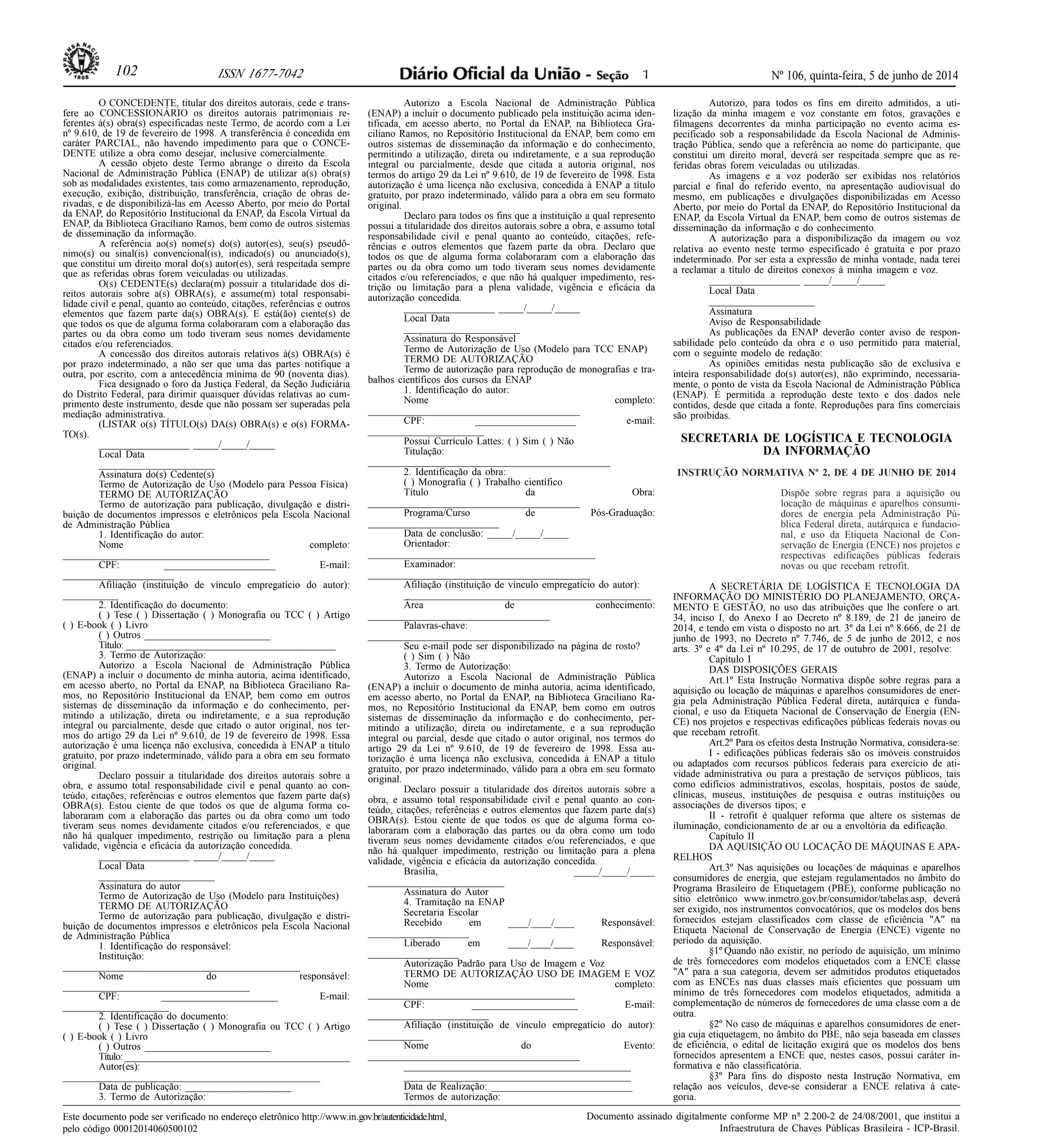 Este documento contém três termos de autorização para publicação de documentos pela Escola Nacional de Administração Pública (ENAP), regulando os direitos autorais de autores individuais, instituições e trabalhos de conclusão de curso da própria ENAP. Além disso, apresenta modelos de termos para uso de imagem e voz em eventos e aviso de responsabilidade sobre o conteúdo das publicações.