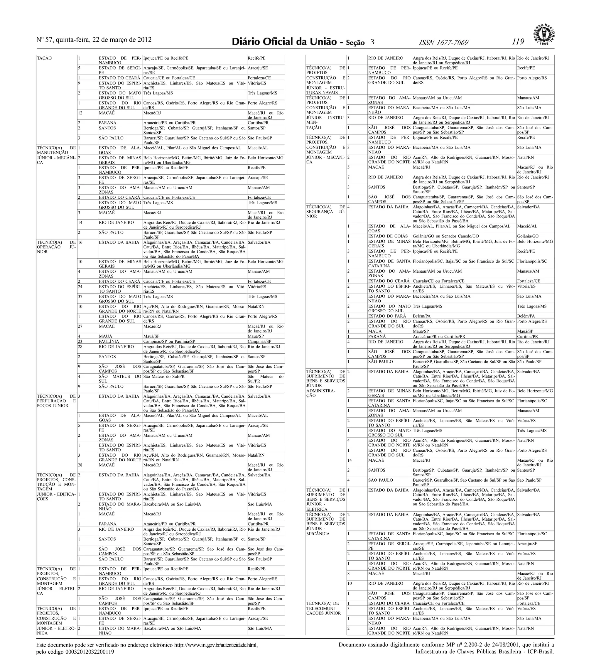 O documento lista vagas de emprego para diversas funções e localidades no Brasil. Há oportunidades para técnicos de projetos, manutenção, operação, perfuração e suprimentos em estados como Bahia, Minas Gerais, Rio de Janeiro e São Paulo. As vagas incluem requisitos de escolaridade e localização.