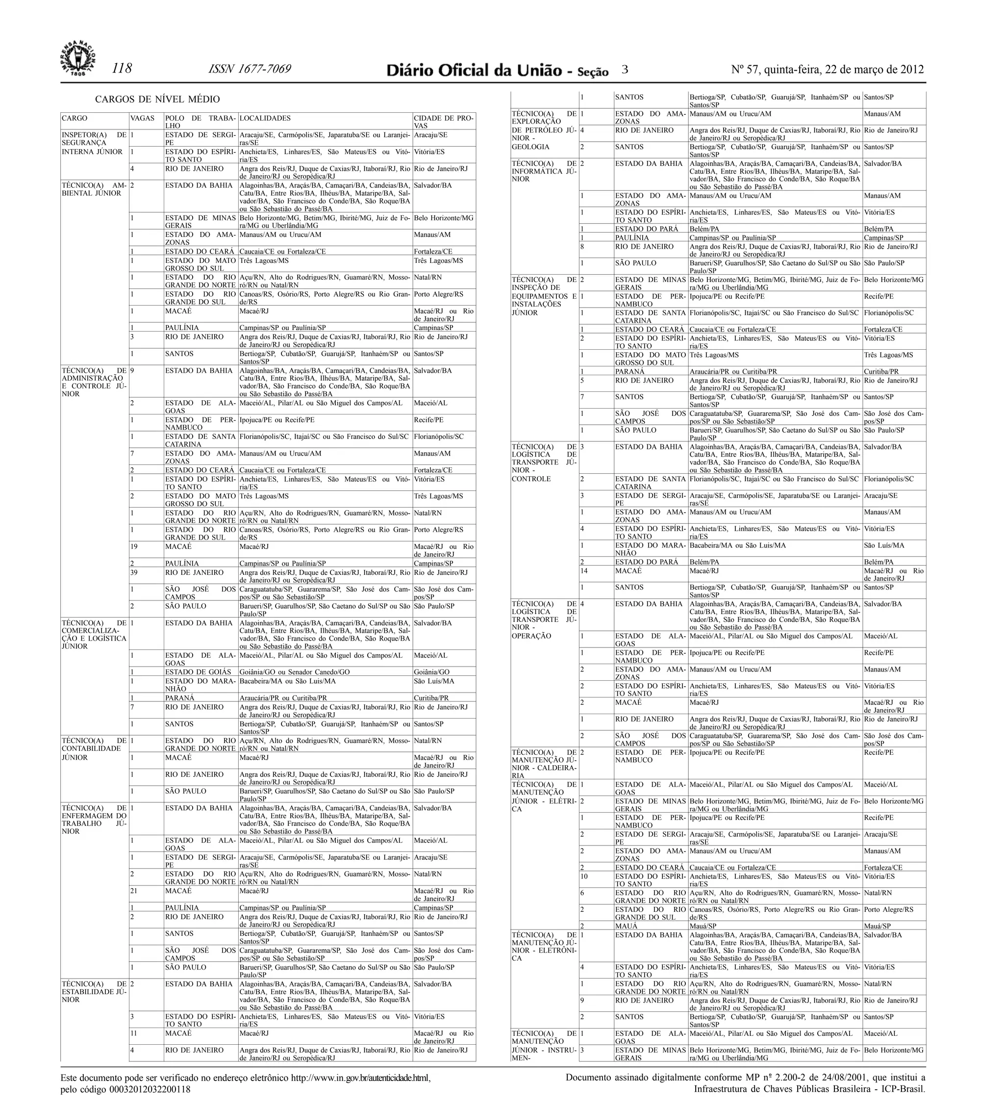 O documento lista vagas de emprego para cargos de nível médio em diversas localidades do Brasil. As vagas incluem técnicos de exploração de petróleo, segurança, informática, meio ambiente, inspeção de equipamentos, administração, comercialização e logística, contabilidade e manutenção. As localidades com mais vagas são o Rio de Janeiro, Macaé e a Bahia.