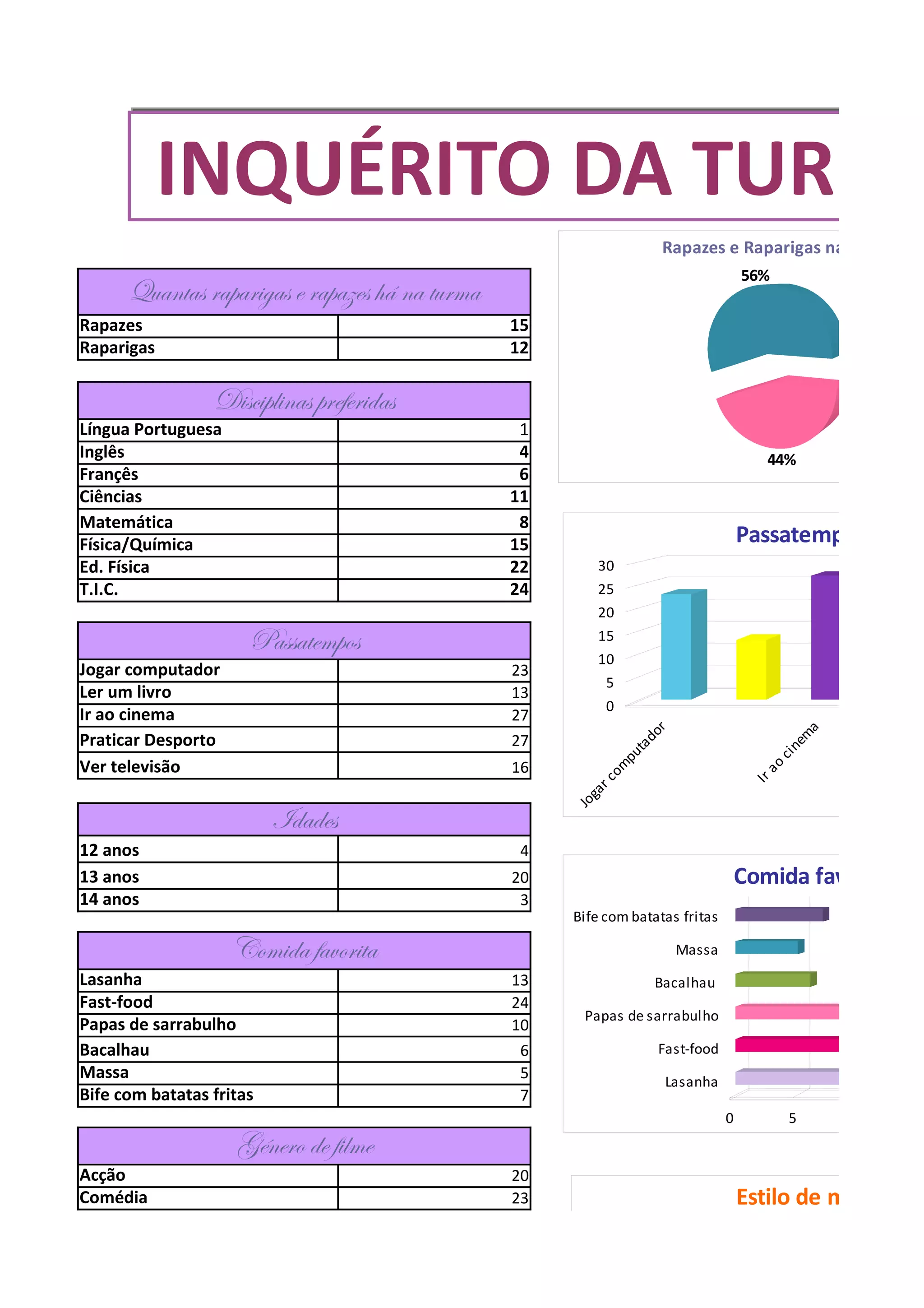 O inquérito mostra que há mais rapazes (15) do que raparigas (12) na turma, que representam 56% e 44% respectivamente. As disciplinas preferidas são Ciências, Matemática e Física/Química. Os passatempos favoritos são jogar computador, ir ao cinema e praticar desporto. A maioria tem 13 ou 14 anos e gosta de comer lasanha, fast food ou papas de sarrabulho.