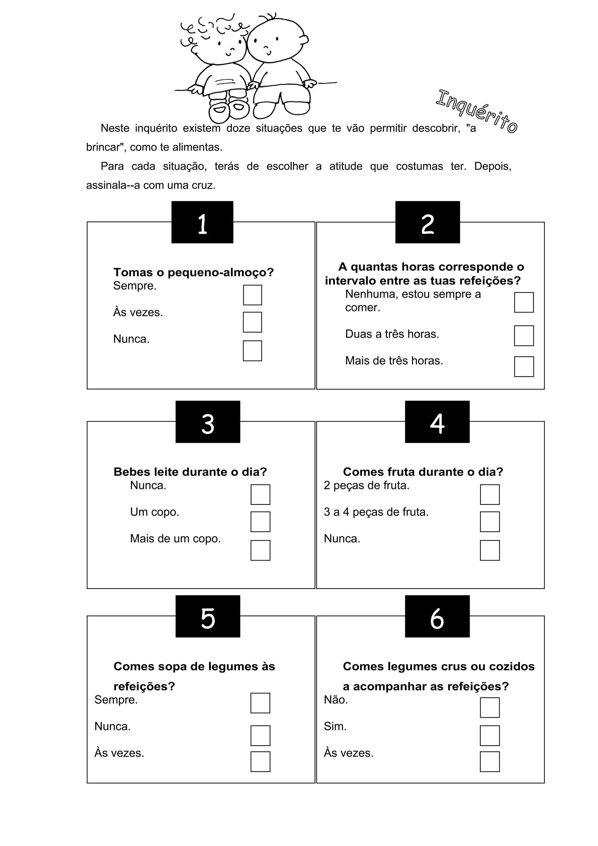 Este documento apresenta um questionário sobre hábitos alimentares para ajudar os jovens a avaliar como se alimentam. O questionário contém 12 situações com 3 opções de resposta cada para escolher. As respostas são pontuadas de acordo com uma tabela para fornecer feedback sobre a qualidade da dieta da pessoa.