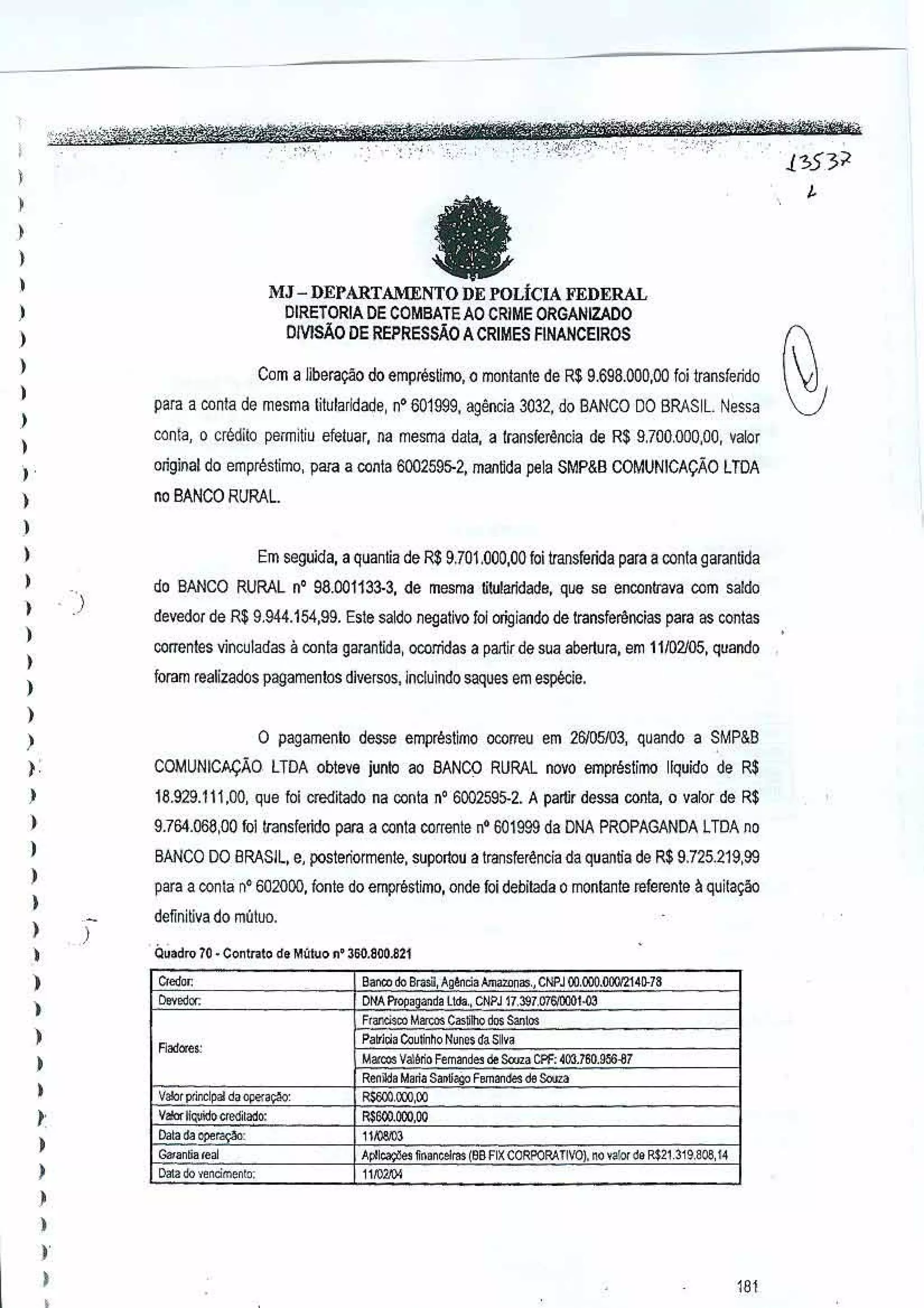 1) O documento descreve vários empréstimos obtidos junto a bancos e sua movimentação em contas correntes de políticos e empresas; 2) Destaca-se empréstimo de R$2,3 milhões ao PT pelo BMG, cujos recursos financiaram diversos pagamentos, incluindo de R$200 mil; 3) Também analisa empréstimos à SMP&B, Graffiti e outras pelo BMG.