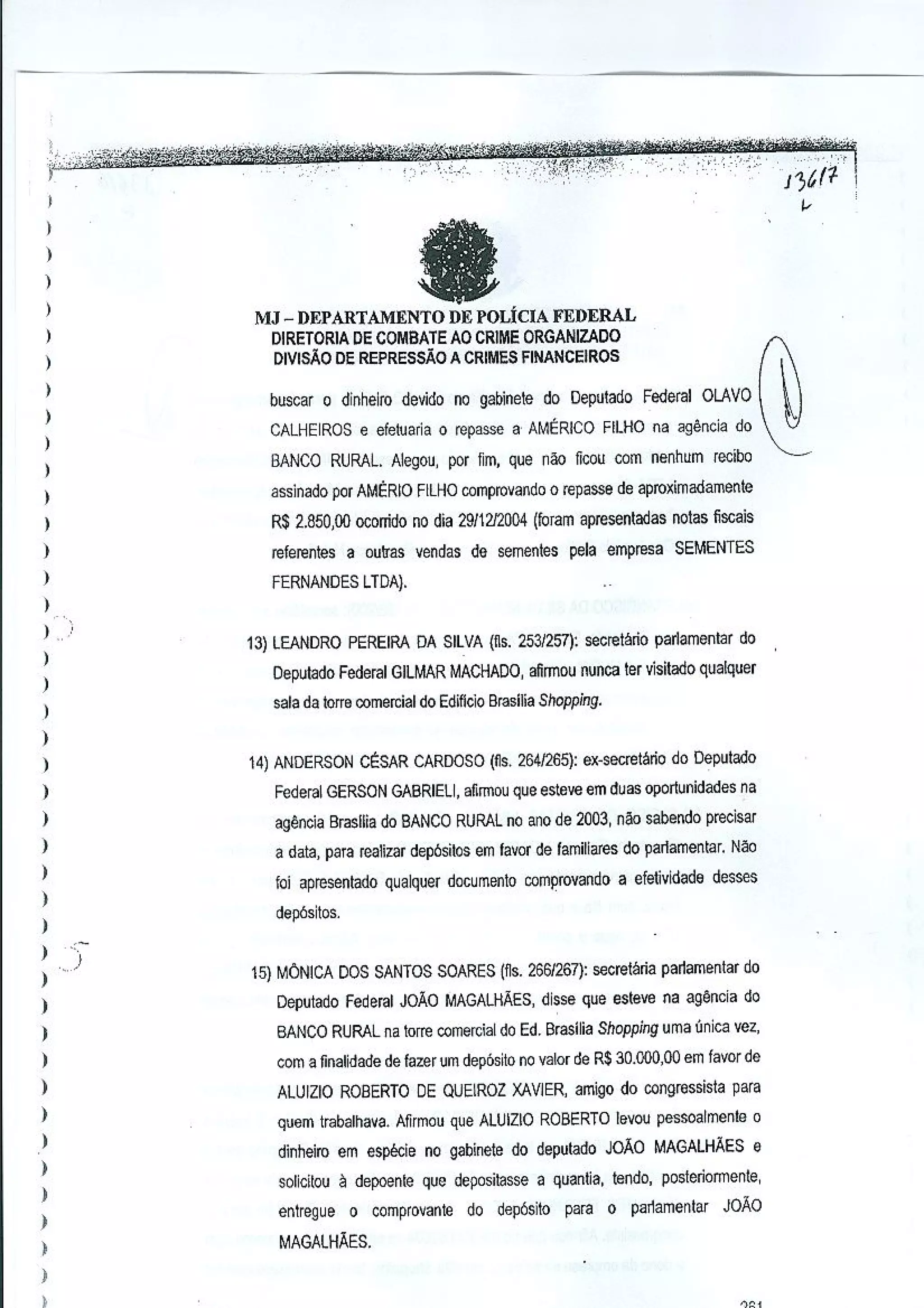 O documento descreve depoimentos de 30 pessoas sobre transações financeiras realizadas na agência do Banco Rural em Brasília. Os depoimentos mencionam depósitos, pagamentos de boletos e transferências bancárias entre políticos, funcionários públicos e empresas entre os anos de 1999 a 2005.
