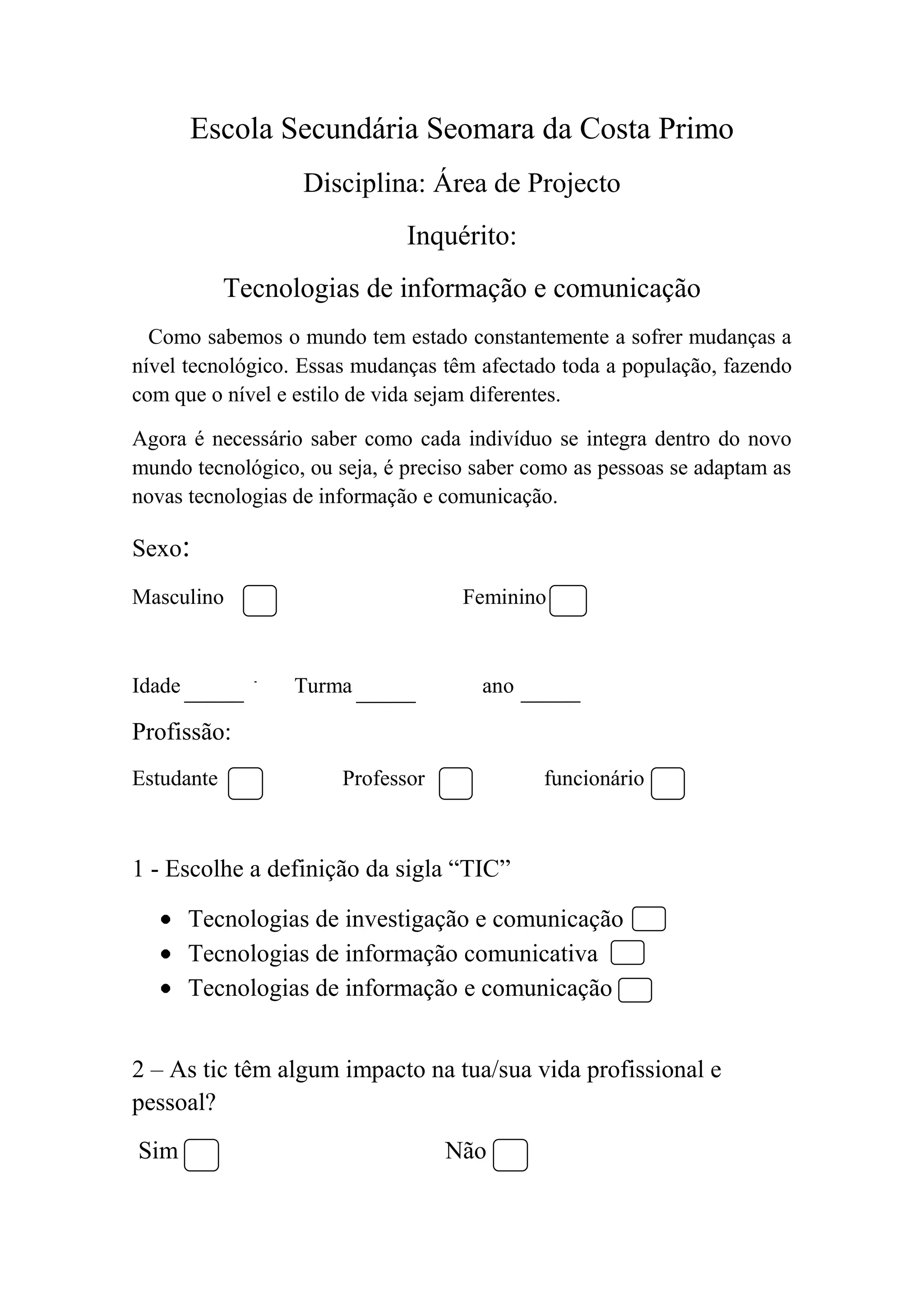 (1) O documento é um inquérito sobre como as tecnologias de informação e comunicação (TIC) afetam a vida das pessoas.