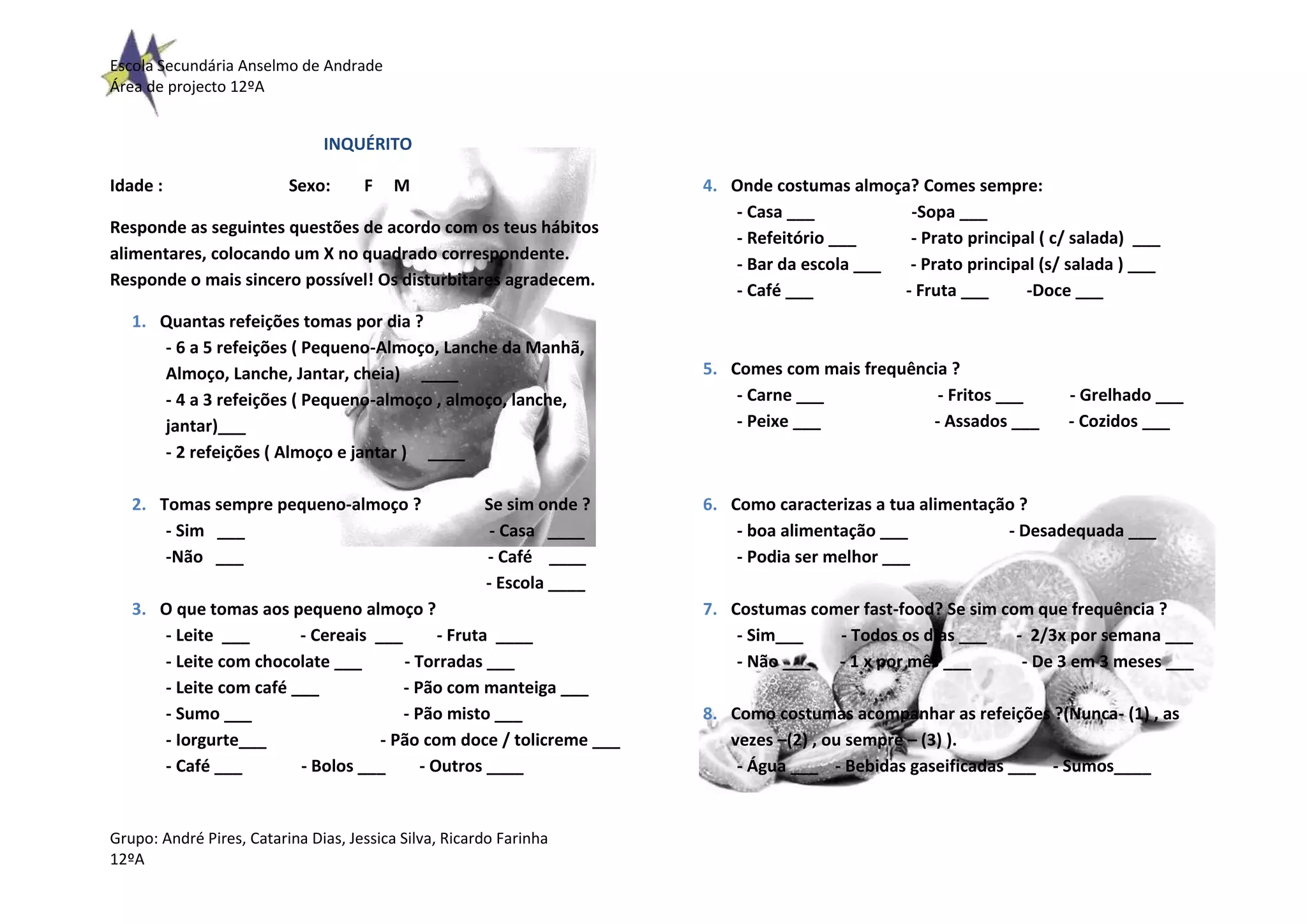 Este questionário avalia os hábitos alimentares de um indivíduo, perguntando sobre o número de refeições por dia, se toma pequeno-almoço e onde, o que come no pequeno-almoço, onde almoça habitualmente e o que come, se come fast food e com que frequência, e como acompanha as refeições.