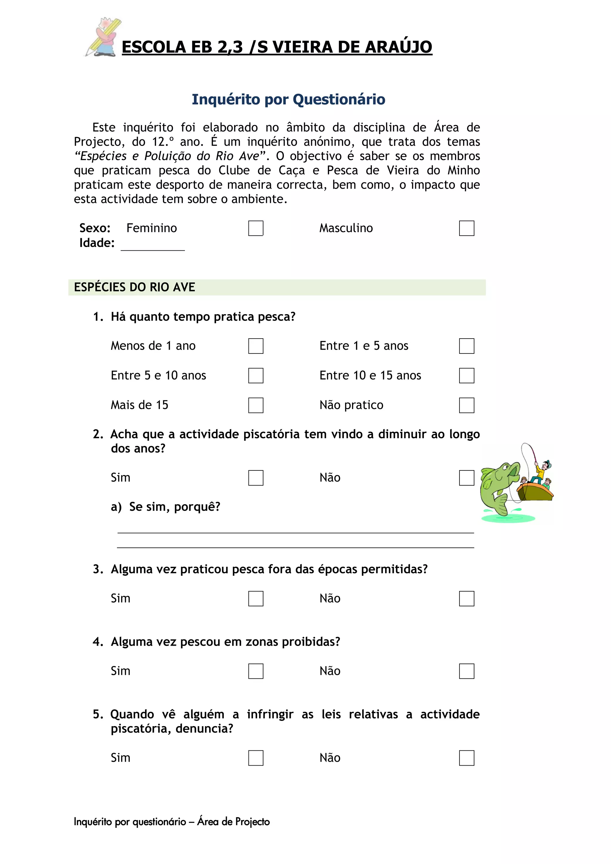 Este inquérito anônimo trata das espécies e poluição do Rio Ave e visa saber se os pescadores seguem as regras da pesca e o impacto desta atividade no meio ambiente. O questionário pergunta sobre tempo de pesca, diminuição de espécies, épocas e zonas proibidas, denúncias de infrações, causas da poluição e participação em campanhas de limpeza. O grupo "SOS.RA" aplicou o questionário para um projeto escolar e disponibilizou os resultados online.