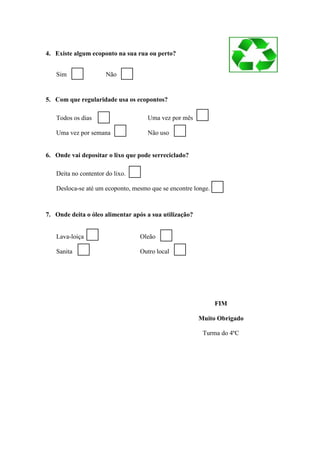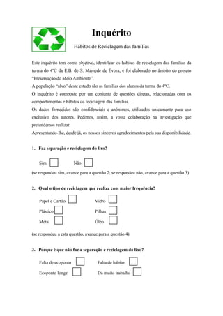 Este inquérito visa identificar os hábitos de reciclagem das famílias da turma do 4oC da escola de S. Mamede de Évora. É composto por perguntas sobre os comportamentos de reciclagem das famílias, como se fazem a separação do lixo, o tipo de materiais reciclados, e a frequência de uso dos ecopontos. A participação é voluntária e os dados são anónimos.