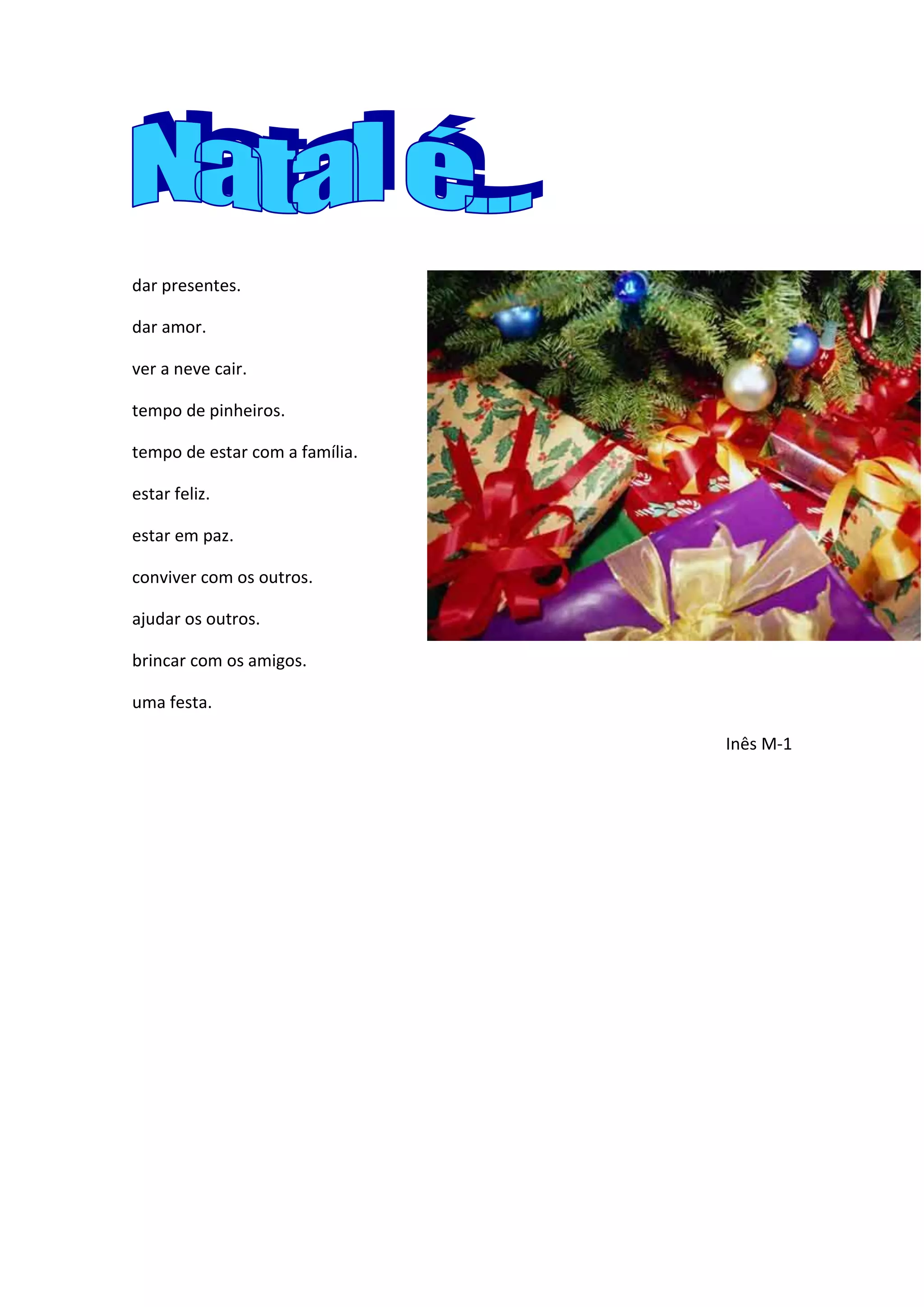 dar presentes.<br />daramor.<br />ver a neve cair.<br />tempo de pinheiros.<br />tempo de estar com a família.<br />estar feliz.<br />estar em paz.<br />conviver com os outros.<br />ajudar os outros.<br />brincar com os amigos.<br />uma festa.<br />Inês M-1<br /> <br />