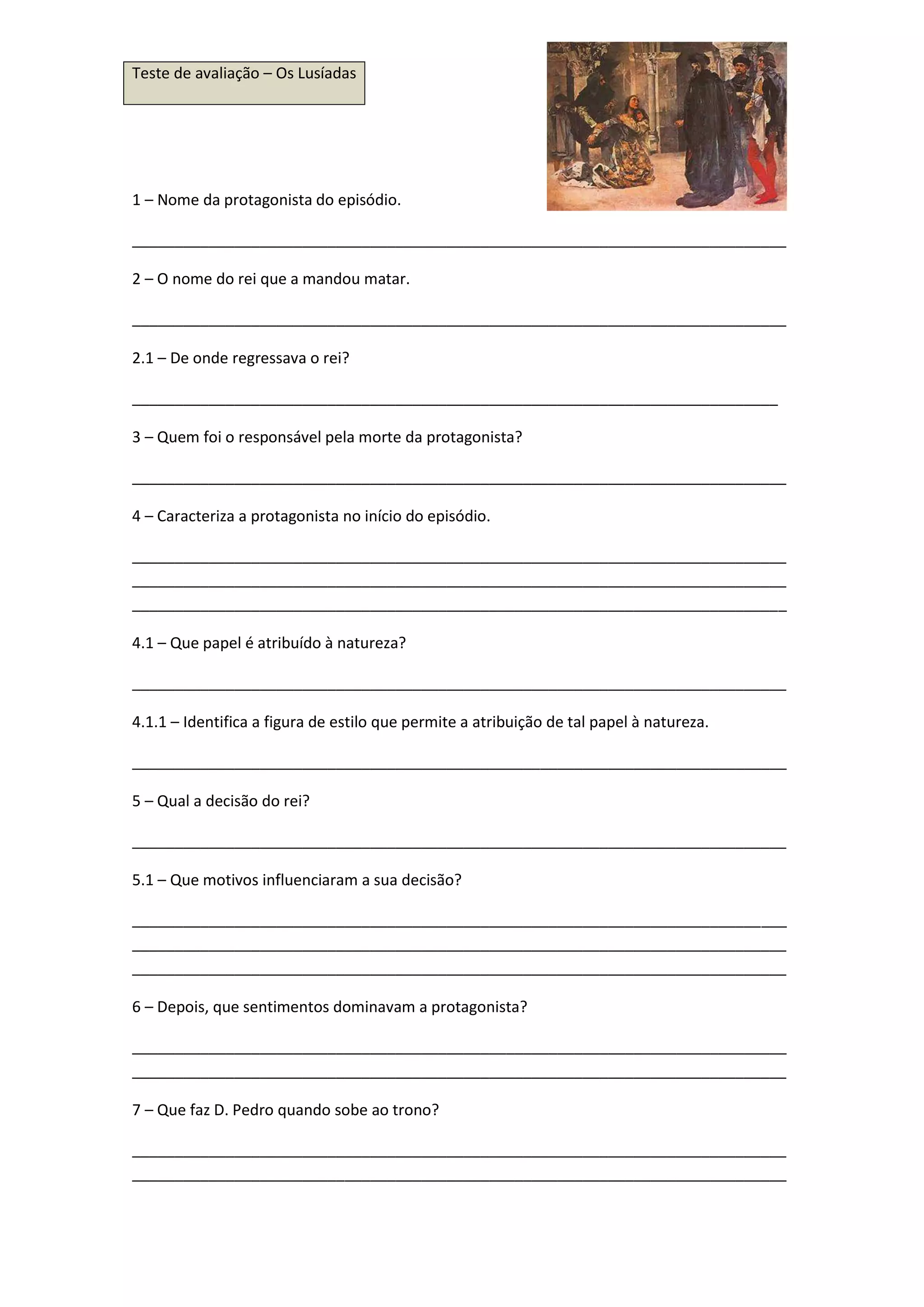 O documento descreve um episódio dos Lusíadas em que uma protagonista feminina é mandada matar pelo rei, que regressava de algum lugar. O responsável pela sua morte é descrito, assim como os sentimentos da protagonista após o ocorrido. Quando D. Pedro sobe ao trono, toma uma certa decisão relacionada com o episódio.