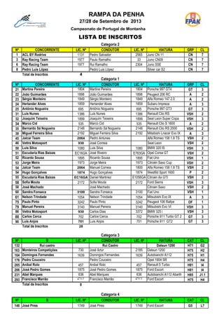 Este documento lista os participantes inscritos em 4 categorias de uma competição de montanha, mostrando o número de inscrição, nome do competidor, número de licença, veículo e grupo/classe de cada participante. Um total de 71 veículos estão inscritos, distribuídos entre as 4 categorias.