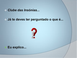 O Clube das Insónias é um grupo de marketing na internet que ensina técnicas e ferramentas para o sucesso online. Os membros aprendem a usar redes sociais, blogs e YouTube para promover seus produtos e negócios. O Clube exige disciplina e trabalho duro, mas ensina habilidades valiosas para crescer como pessoa e profissional do marketing digital.