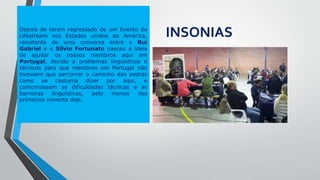 Este documento descreve a história por trás do nome "Insónias" e o que ele representa. O nome surgiu após conversas entre membros sobre criar grupos de trabalho online para ajudar outros membros em Portugal a contornar barreiras linguísticas e técnicas. Estes grupos noturnos acabaram recebendo o nome "Grupo dos Insónias" porque seus participantes ficavam sem sono devido aos longos debates sobre marketing digital. Ao longo do tempo, os Insónias evoluíram para ensinar cada vez mais habilidades avanç