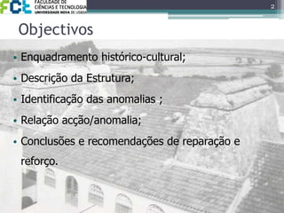 Este documento fornece um relatório sobre a inspeção visual de três chaminés históricas em Salvaterra de Magos. O relatório descreve a estrutura das chaminés, identifica anomalias estruturais causadas por escavações adjacentes, e recomenda reparos e reforços para estabilizar as estruturas.
