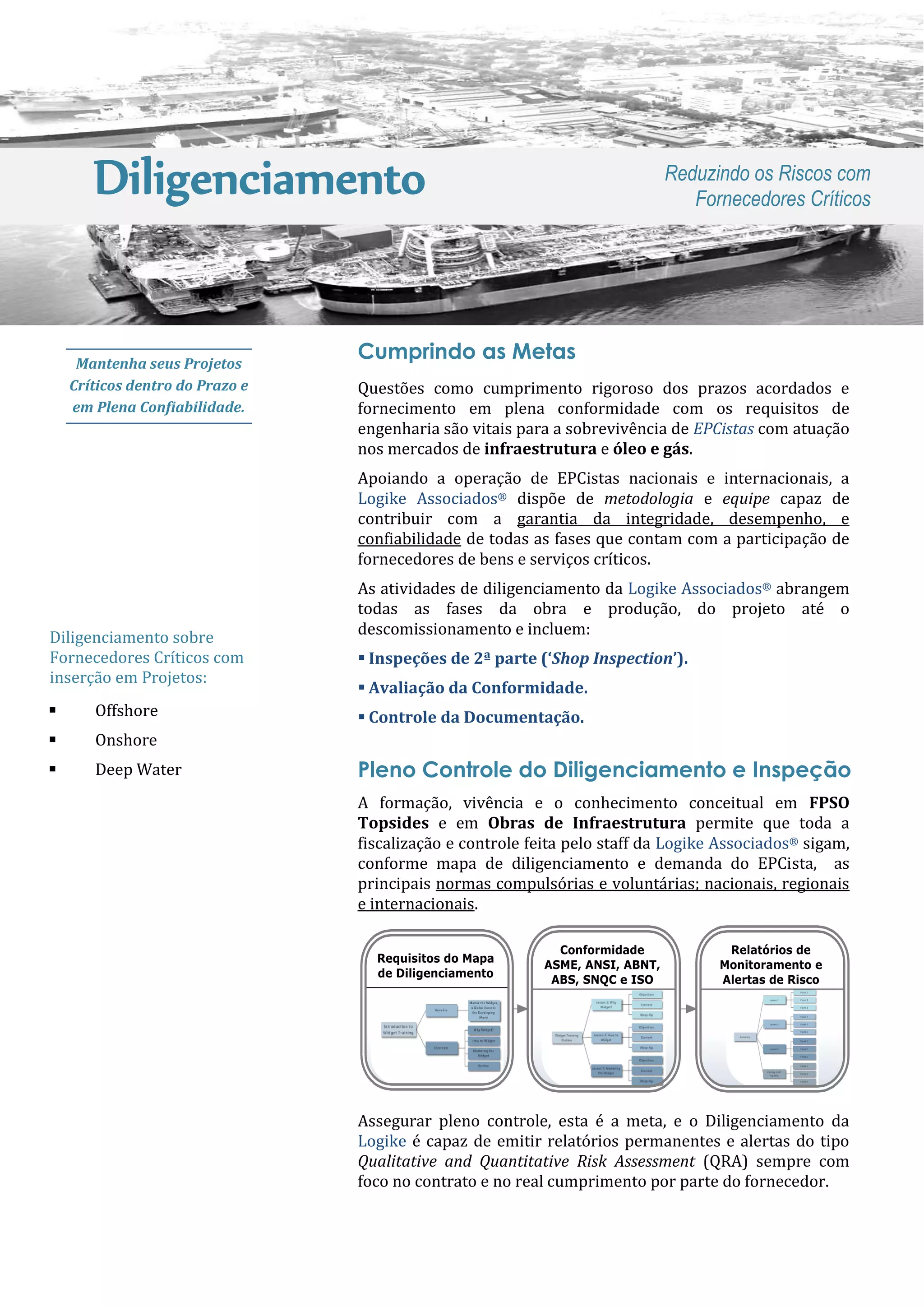 O documento descreve os serviços de diligenciamento da Logike Associados®, fundamentais para garantir o cumprimento de prazos e requisitos em projetos de infraestrutura e petróleo e gás. A empresa utiliza metodologias e ferramentas avançadas, como inspeções de segunda parte e modelagem preditiva, para mitigar riscos associados a fornecedores críticos. A Logike Associados® se destaca por sua experiência e reputação em avaliar fornecedores e assegurar a integridade dos projetos.