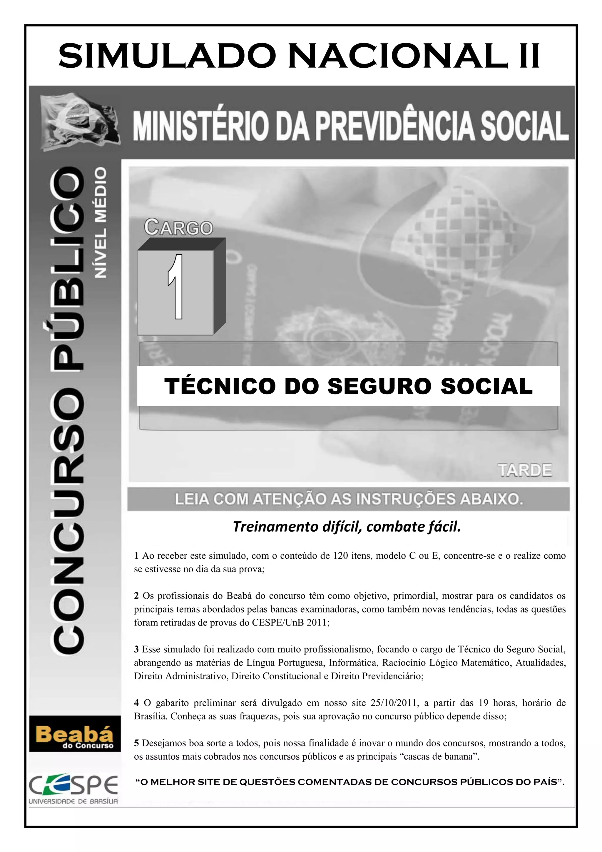 1) O documento apresenta um simulado sobre o cargo de Técnico do Seguro Social com 120 questões sobre diversas matérias como Língua Portuguesa, Informática, Raciocínio Lógico Matemático e Direito.