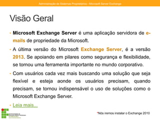 O documento descreve a instalação e configuração do Microsoft Exchange Server 2010 em um servidor Windows Server 2008 R2. Ele explica os requisitos do sistema, como preparar o Active Directory e esquema, e as etapas para instalar e configurar o Exchange Server 2010, incluindo acesso via Outlook Web App.