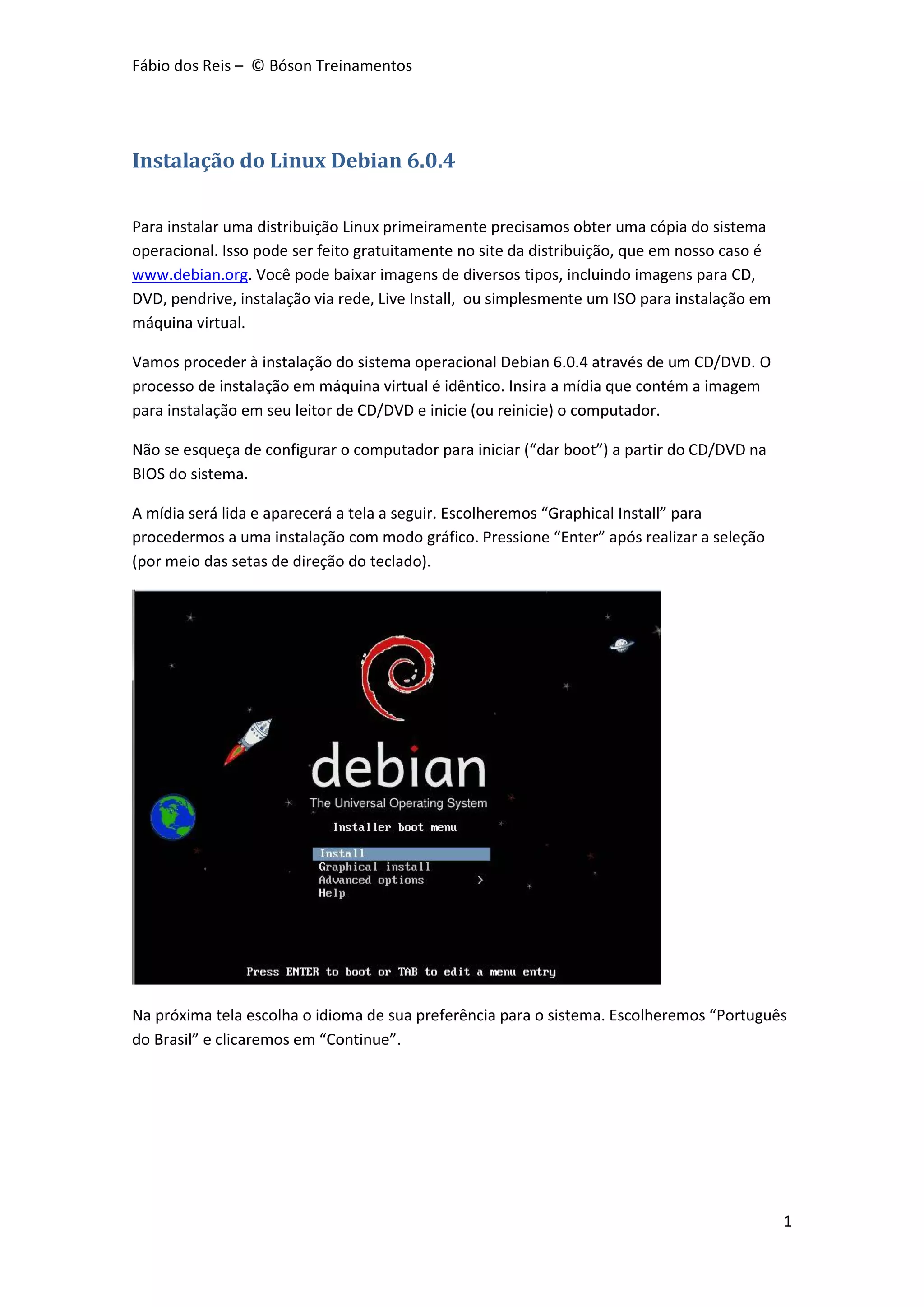 O documento fornece instruções passo-a-passo para instalar o sistema operacional Linux Debian 6.0.4, descrevendo o processo de download, gravação em CD/DVD, boot, seleção de idioma, configuração de rede, particionamento de disco, instalação de pacotes e configuração inicial do sistema.