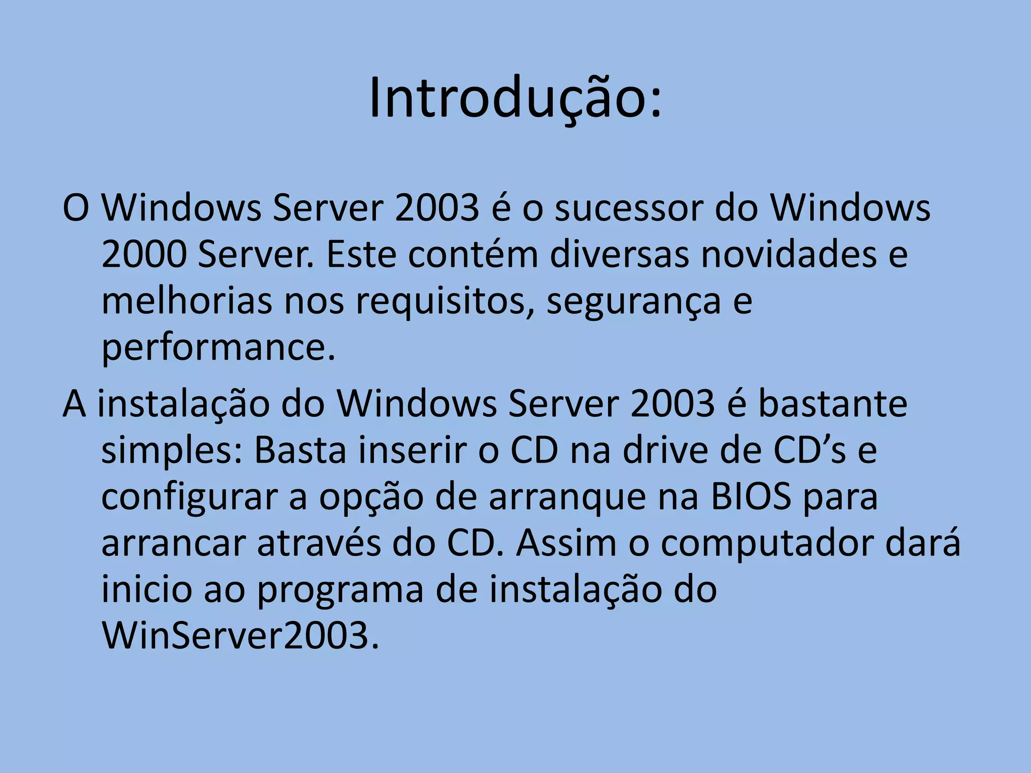 Este documento fornece instruções passo-a-passo para instalar o Microsoft Windows Server 2003, incluindo inserir o CD de instalação, configurar partições do disco rígido, inserir a chave do produto, e concluir a instalação e configuração da rede.