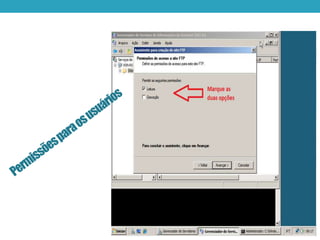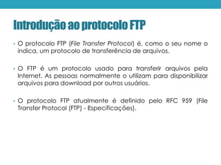 O documento descreve o protocolo FTP, incluindo seu modelo cliente-servidor com canais separados para comandos e dados, e como configurar e acessar um servidor FTP no Windows Server 2008.