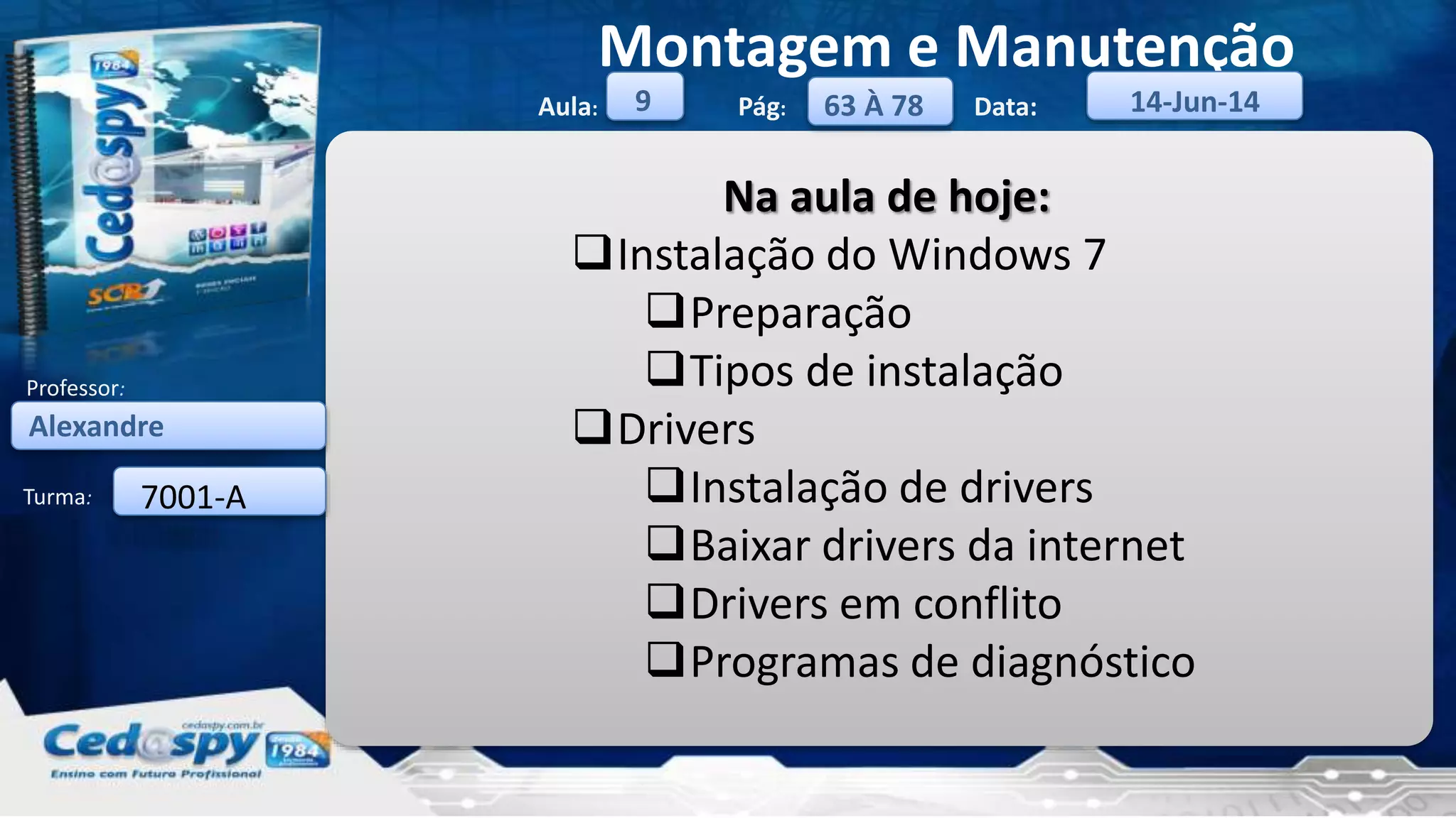 O documento discute a instalação do Windows 7, incluindo preparação, tipos de instalação, instalação de drivers e resolução de problemas. Ele fornece instruções passo a passo sobre como fazer backup, formatar o disco, iniciar a instalação, selecionar idioma e teclado, particionar o disco, instalar drivers e diagnosticar problemas de driver.