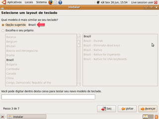 O documento descreve a instalação do sistema operacional Ubuntu em um computador, incluindo a alocação de espaço em disco para Swap, Sistema Operacional e Documentos, e fornece instruções sobre como instalar programas no Ubuntu usando a Central de Programas, Synaptic ou o Terminal.