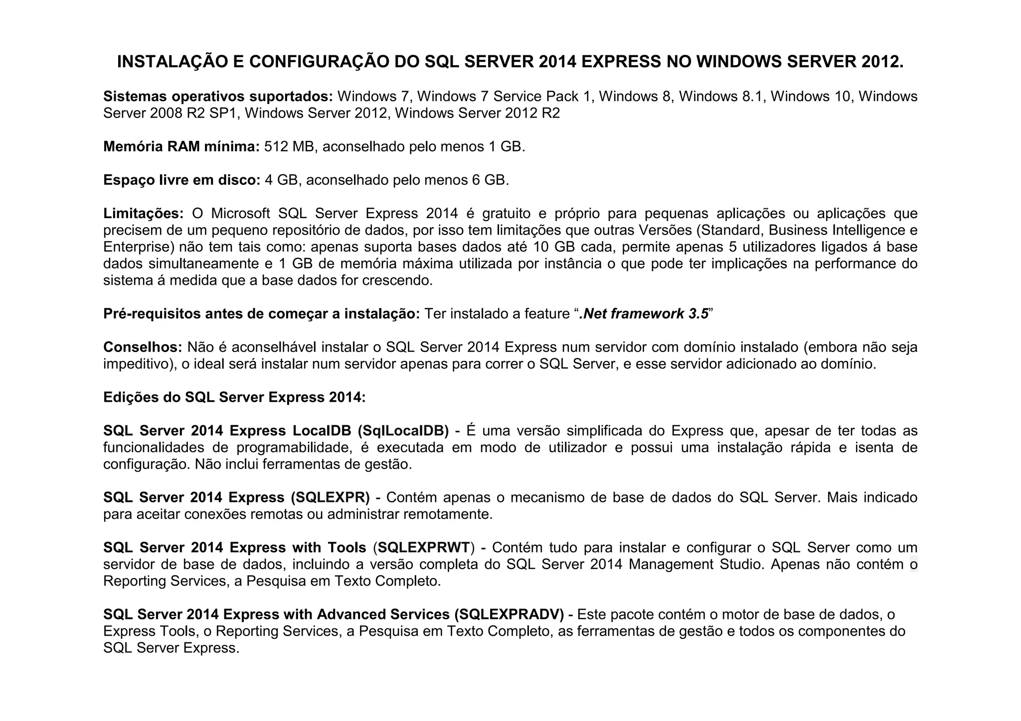 Este documento fornece instruções passo-a-passo para instalar e configurar o Microsoft SQL Server 2014 Express no Windows Server 2012, incluindo requisitos mínimos, pré-requisitos, edições disponíveis e os 29 passos para completar a instalação e configuração.