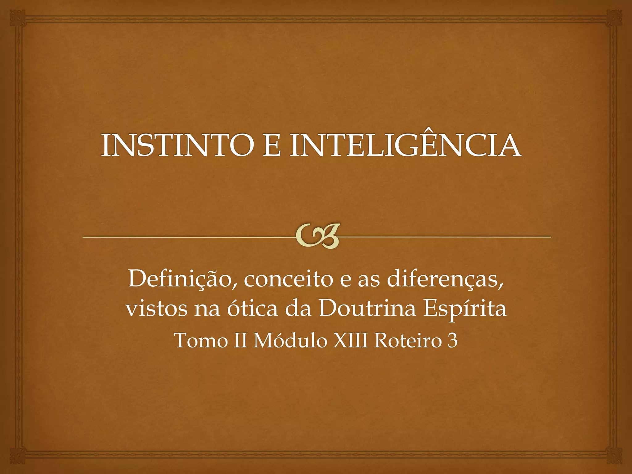 O documento discute o instinto e a inteligência. Define instinto como um impulso inato e automático para viver bem e perpetuar a espécie, enquanto a inteligência é uma faculdade racional que permite pensar e evoluir. Também diferencia instinto de reflexo, paixão e razão.