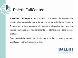 A Daleth CallCenter é uma empresa de teleatendimento que usa pessoas qualificadas e tecnologia avançada para fornecer soluções personalizadas de atendimento ao cliente para empresas de diferentes setores. Sua visão é oferecer o melhor atendimento possível por meio de tecnologia, recursos humanos e comprometimento.