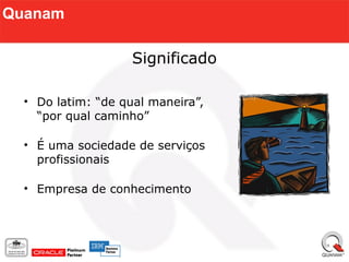 O documento resume os principais aspectos da empresa Quanam, especializada em serviços profissionais. A empresa possui presença em vários países da América Latina e atua em mais de 25 países. Seu capital intelectual inclui capital humano, estrutural, de clientes e tecnológico, com foco em metodologias de gestão de projetos, implantação e atualização de sistemas.