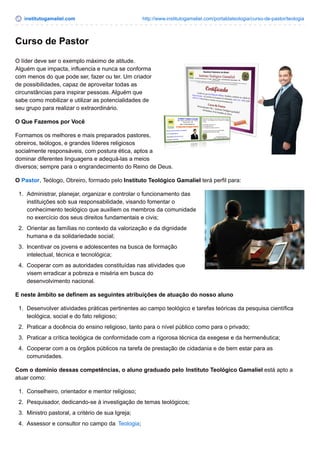 O documento descreve um curso de pastor oferecido pelo Instituto Teológico Gamaliel, com o objetivo de formar pastores, obreiros e líderes religiosos. O curso é oferecido à distância e abrange diversas matérias teológicas e bíblicas ao longo de até 24 meses. Ao final, os alunos recebem um certificado, porém o curso não é reconhecido pelo MEC.