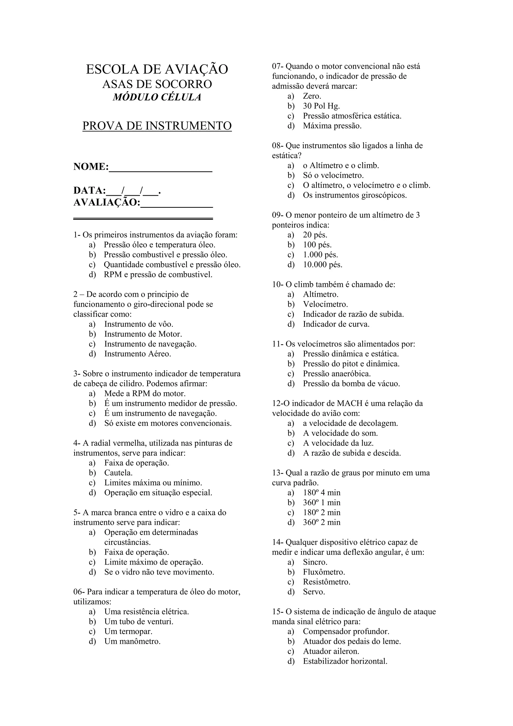 Este documento parece ser um teste sobre instrumentos de aviação. Contém 30 perguntas sobre os primeiros instrumentos desenvolvidos, os componentes e funções de vários instrumentos como altímetro, velocímetro, indicador de temperatura de óleo, entre outros. Também aborda sistemas como piloto automático e seus componentes.