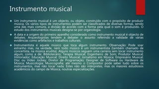 Um instrumento musical é um objeto construído para produzir música através de vibrações sonoras. Os instrumentos podem ser classificados de acordo com como o som é produzido e possuem componentes como o elemento produtor de som, corpo e caixa de ressonância. Existem diversos tipos de instrumentos como cordas, percussão, sopro e teclas.
