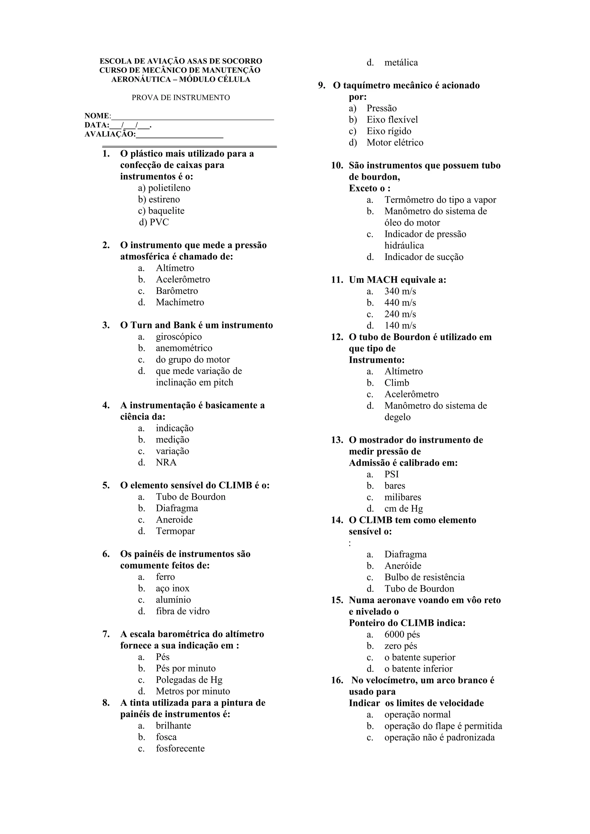 Este documento contém 30 perguntas sobre instrumentos aeronáuticos para uma prova sobre manutenção de célula. As perguntas cobrem tópicos como os materiais usados na fabricação de painéis de instrumentos, os diferentes tipos de instrumentos como altímetro, velocímetro e seus componentes sensíveis.