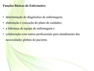 O documento descreve os instrumentos básicos para o cuidado de enfermagem, incluindo comunicação, planejamento, avaliação, método científico, observação, trabalho em equipe, destreza manual e criatividade. Estes conceitos fundamentais são essenciais para o desenvolvimento profissional do estudante de enfermagem.