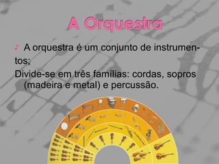O documento descreve os diferentes instrumentos musicais de uma orquestra, divididos em três famílias: cordas, sopros e percussão. Detalha os instrumentos de cada família, como produzem som e como são tocados.