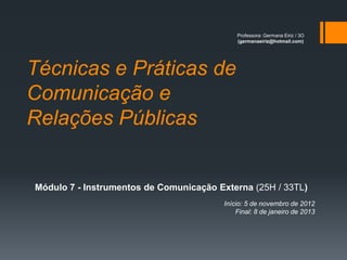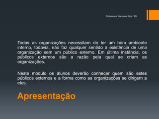 Este documento descreve um módulo sobre instrumentos de comunicação externa. O módulo irá ensinar sobre identificar públicos externos, formas de comunicar com eles, suportes de comunicação externa e ferramentas como comunicados de imprensa e eventos. O módulo também cobrirá a relação entre relações públicas e mídia e avaliação dos alunos.