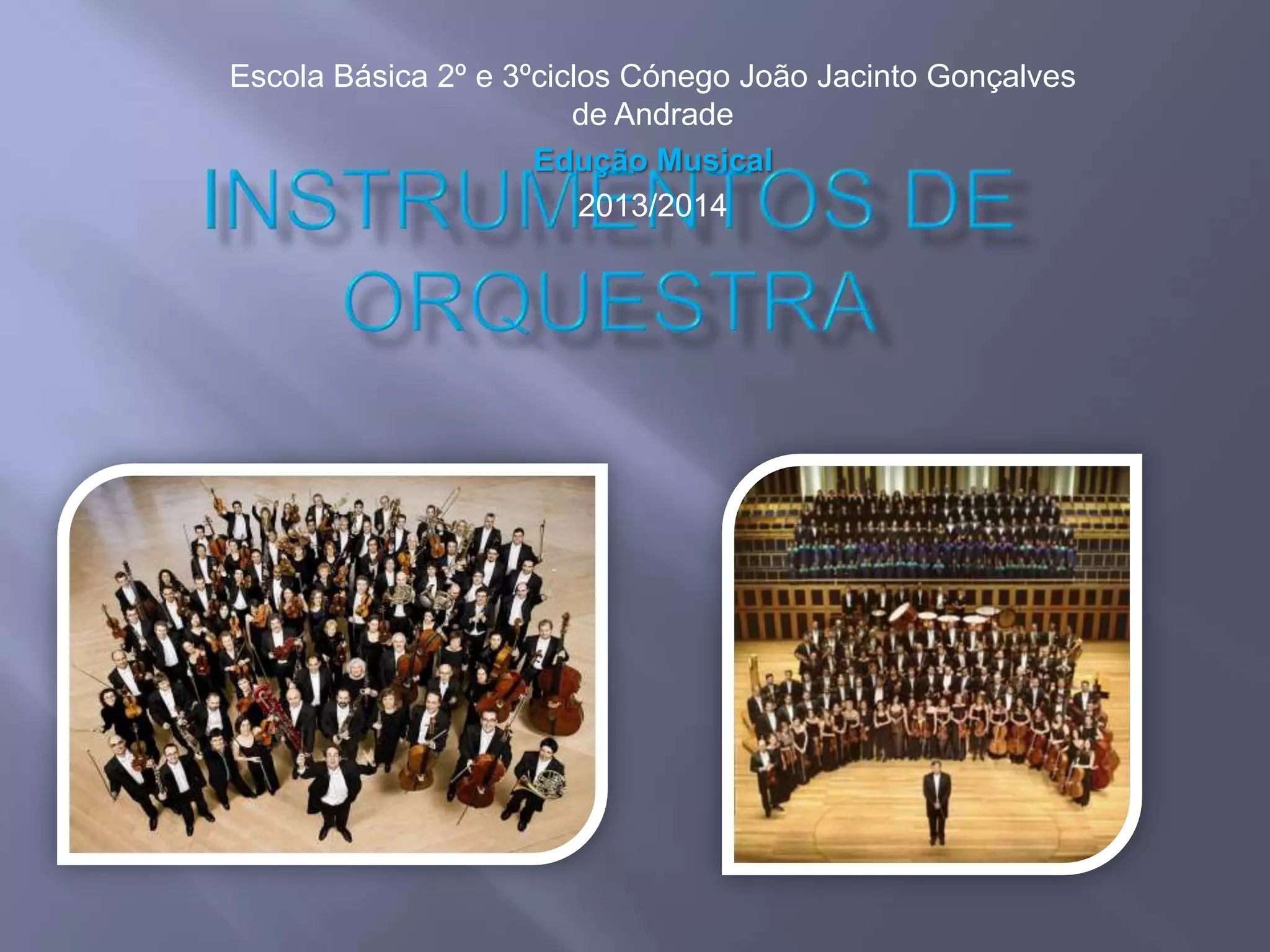 O documento lista os instrumentos musicais ensinados na Escola Básica 2o e 3ociclos Cónego João Jacinto Gonçalves de Andrade no ano letivo de 2013/2014, divididos em cordas, madeiras, metais e percussão.