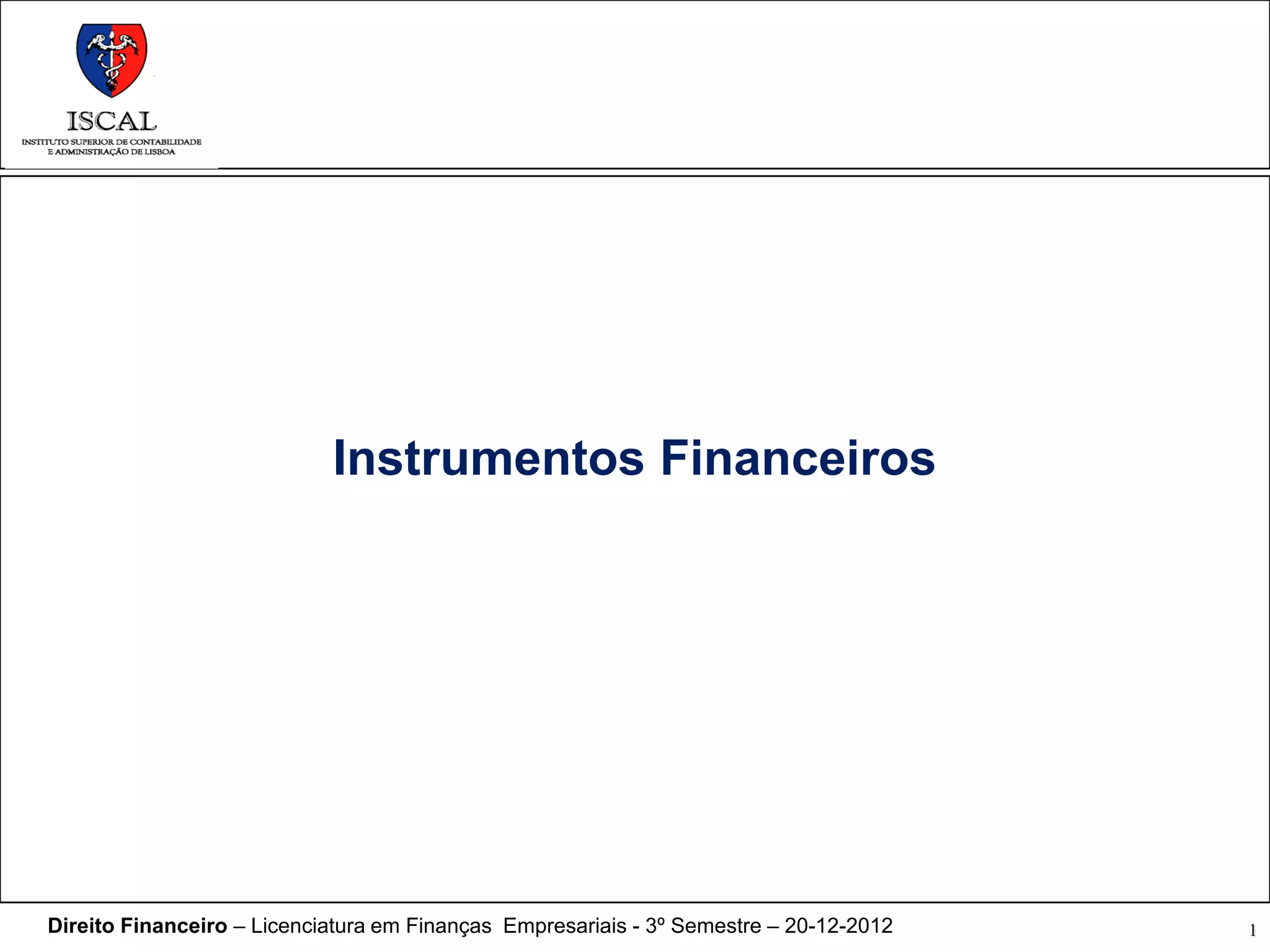O documento discute instrumentos financeiros, definindo-os como contratos que criam ativos e passivos financeiros. Ele descreve os elementos mínimos de um instrumento financeiro, as tipologias principais e como eles podem ser classificados como complexos ou não complexos. O documento também discute o regime jurídico comum a todos os instrumentos financeiros.